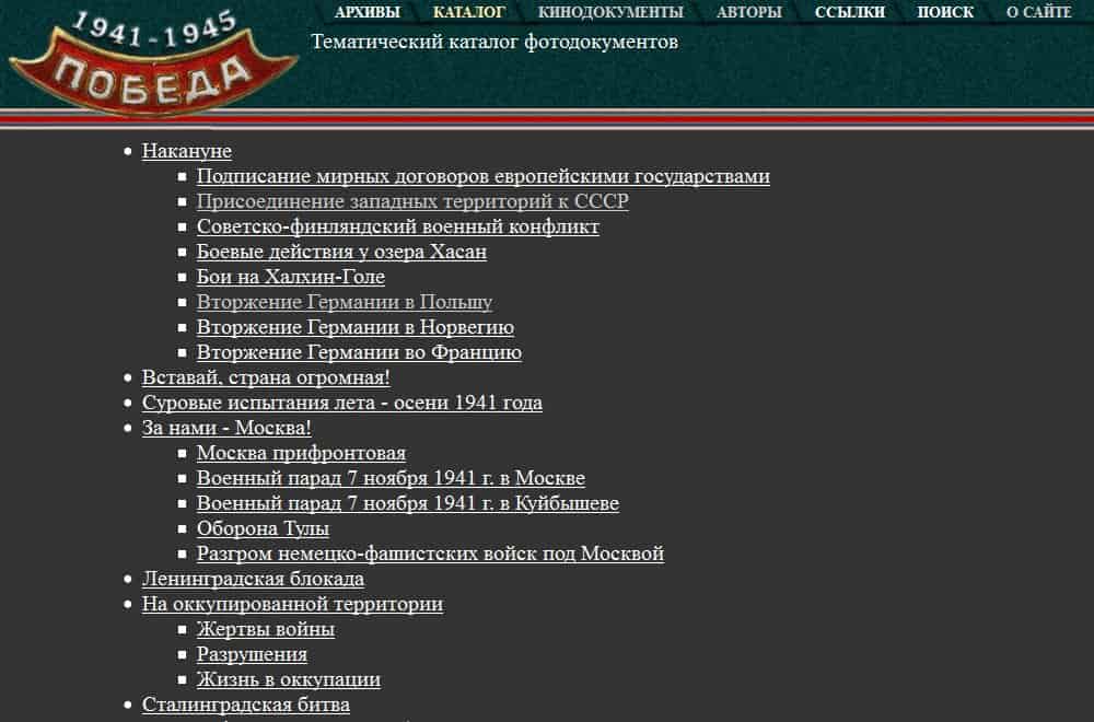 Фотохроника. Сайт «Победа. 1941–1945» координирует Федеральное архивное агентство (Росархив) и включает материалы, хранящиеся в государственных архивах Российской Федерации. «Отбор фотодокументов осуществлялся с учетом уникальности, их информационно-содержательной и тематической значимости, а также физического состояния». Боевые действия, солдаты, военнопленные, военный быт, тыловые фотографии, блокада Ленинграда и многие другие фотосвидетельства. Есть также видеоматериалы, например, 19-минутный ролик «Разрушения», рассказывающий о разрушениях, в том числе, храмов и монастырей.