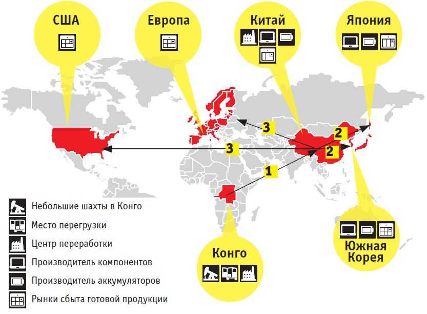 Путь редкоземельных элементов на примере кобальта: 1 -экспорт кобальта из небольших конголезских шахт в Китай; 2 — поставка переработанного кобальта азиатским производителям аккумуляторов; 3 — поставка аккумуляторов производителям электроники и автомобилей