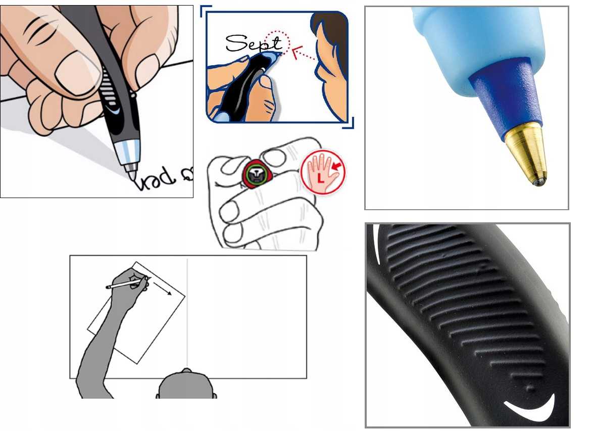 Как пример рассмотрим ручку «Visio» от французской компании MAPED. Она разработана с учетом особенностей письма леворуких людей. Подходит даже тем, кто только учится писать, поскольку имеет специальный изгиб под левую руку. Как правило, в таких письменных принадлежностях используются несменные стержни.