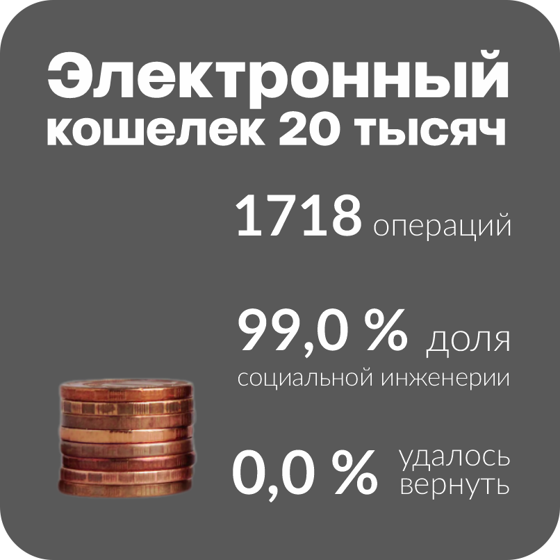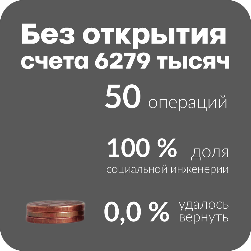 Почти каждый второй случай — 46,5 % — приходится на социальную инженерию. Этим термином называют ловушки, попадая в которые, люди самостоятельно отдают деньги преступникам. Говорят по телефону, выполняют все команды: переходят по ссылкам, диктуют коды, несут деньги в банкомат.